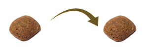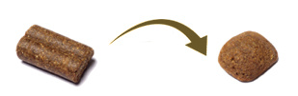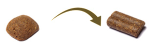 Met het overstappen van krokante (geëxtrudeerde) brokken naar een geperste brok, is het beste om in één keer over te stappen en voeding niet te mengen. In een enkel geval kan de ontlasting door de wisseling van voeding iets anders zijn dan normaal, dit is niet ernstig.