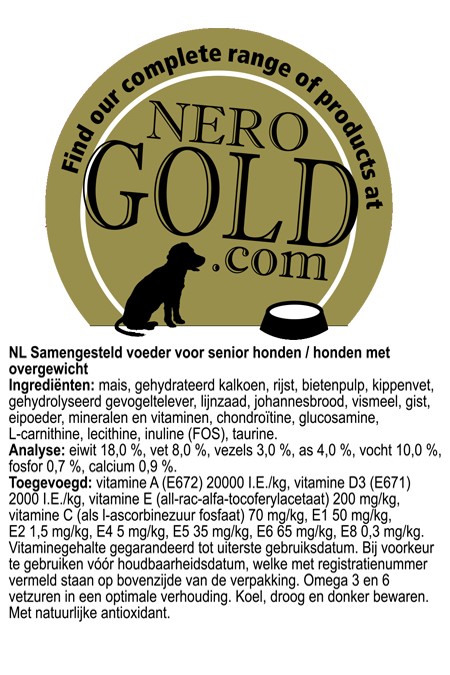 Nero Gold Hond Senior Light is natuurijk dieet hondenvoer samengesteld voor senior honden vanaf ongeveer 10 jaar oud. Dit senior hondenvoer is voor honden met een laag energie niveau en voor honden die kampen met overgewicht. De hoge kwaliteit van eiwit (vlees) zorgt voor sterke en soepele spieren, de toevoeging van glucosamine en chondroitine zorgen voor de juiste ondersteuning voor sterke botten en gezonde gewrichten.