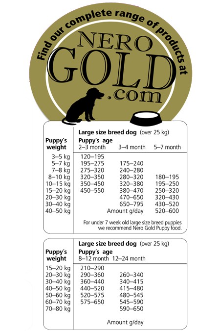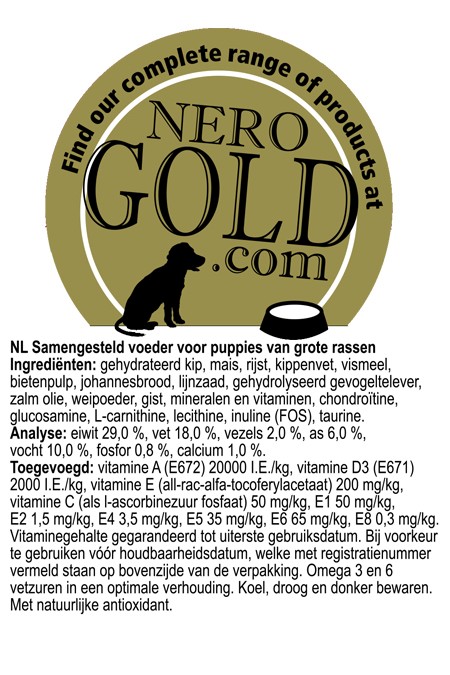 Nero Gold Puppy Maxi zijn de beste puppybrokken voor grote rassen. De brokken zijn er voor puppy's die een volwassen gewicht behoren te halen van boven de 25kg. Nero Gold Puppy Maxi bevat hoge kwaliteit dierlijke eiwitten (kippenvlees) voor de ontwikkeling van sterke en soepele spieren.