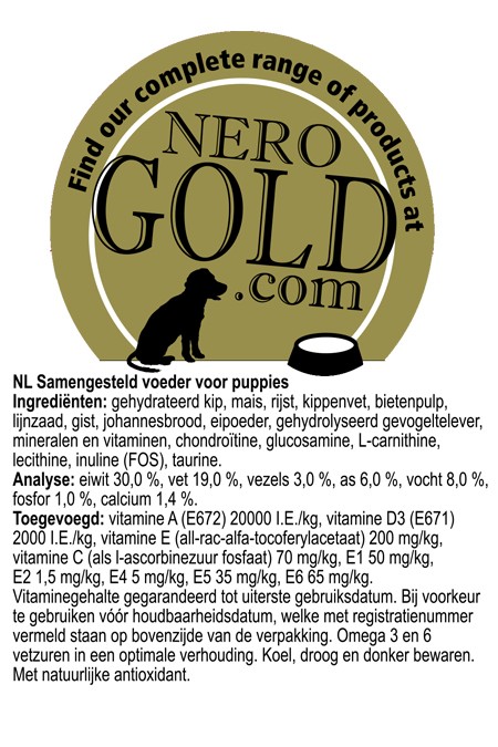 Nero Gold Puppy zijn de beste puppybrokken met ingrediënten van hoge kwaliteit! Voedingstoffen van zeer hoge kwaliteit zoals dierlijke eiwitten (kippenvlees), vetten, koolhydraten, vezels en belangrijke mineralen en vitaminen zorgen voor een optimale groei van je pup.