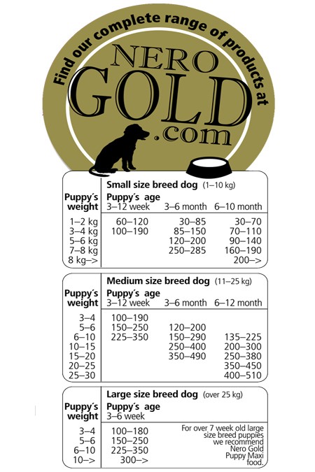 Puppy voer dient gevoerd te worden totdat de pup zijn volwassen gewicht nagenoeg behaald heeft. Honden die een gewicht behoren te halen van 25kg of meer dienen met circa 7 weken over te schakelen op Nero Gold Puppy Maxi.