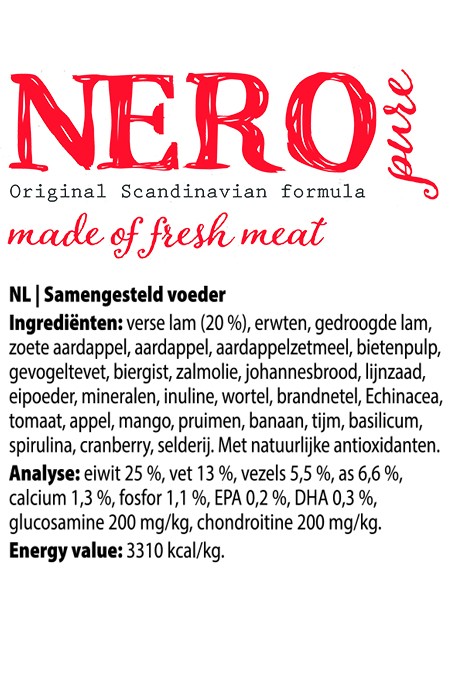 Nero Pure is 100% graanvrij, waardoor het ideaal is voor honden met allergieën of gevoelige darmen. Het hondenvoer met lam heeft een ideale verhouding van dierlijke eiwitten en groenten. Elk van de ingrediënten die we gebruiken, is zorgvuldig geselecteerd om de hoogste voedingswaarden te leveren. Wat Nero Pure excelent maakt, is de kwaliteit van het vers vlees welke we zorgvuldig hebben geselecteerd voor ons hondenvoer met lam. Puur vers vlees geeft je hond energie, een fantastische gezondheid en een uitstekende conditie.