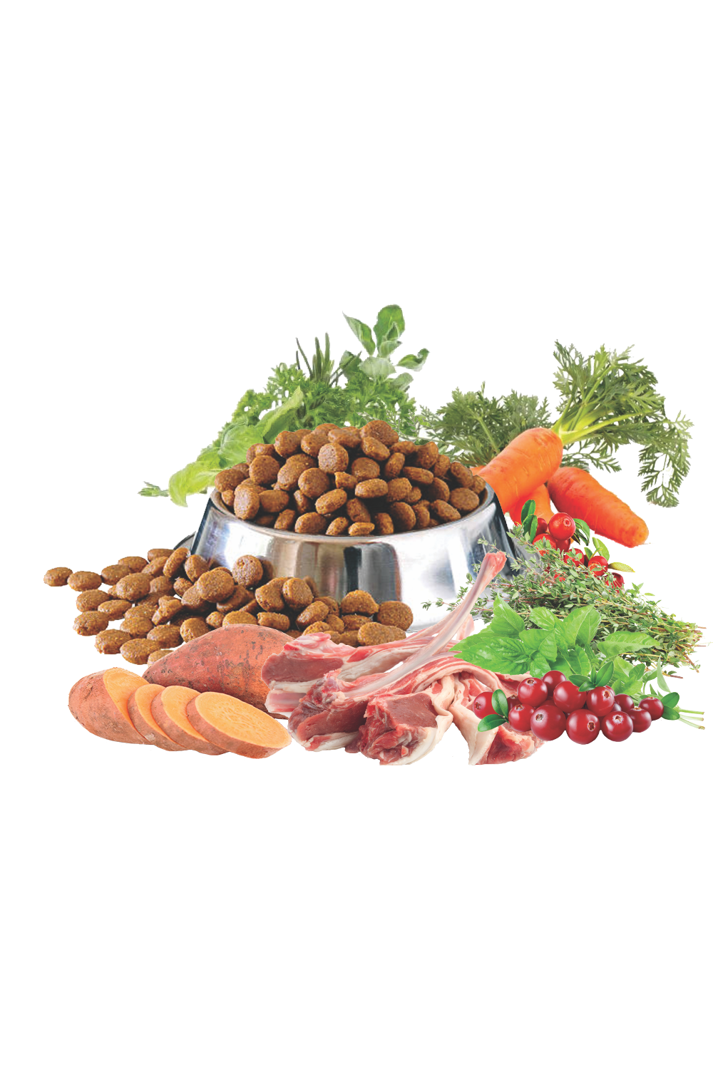 Ingrediënten: Verse lam (20%), erwten, gedroogde lam, zoete aardappel, aardappel, aardappelzetmeel, bietenpulp, gevogeltevet, biergist, zalmolie, johannesbrood, lijnzaad, eipoeder, mineralen, inuline, wortel, brandnetel, echinacea , tomaat, appel, mango, pruimen, banaan, tijm, basilicum, spirulina, cranberry, selderij.