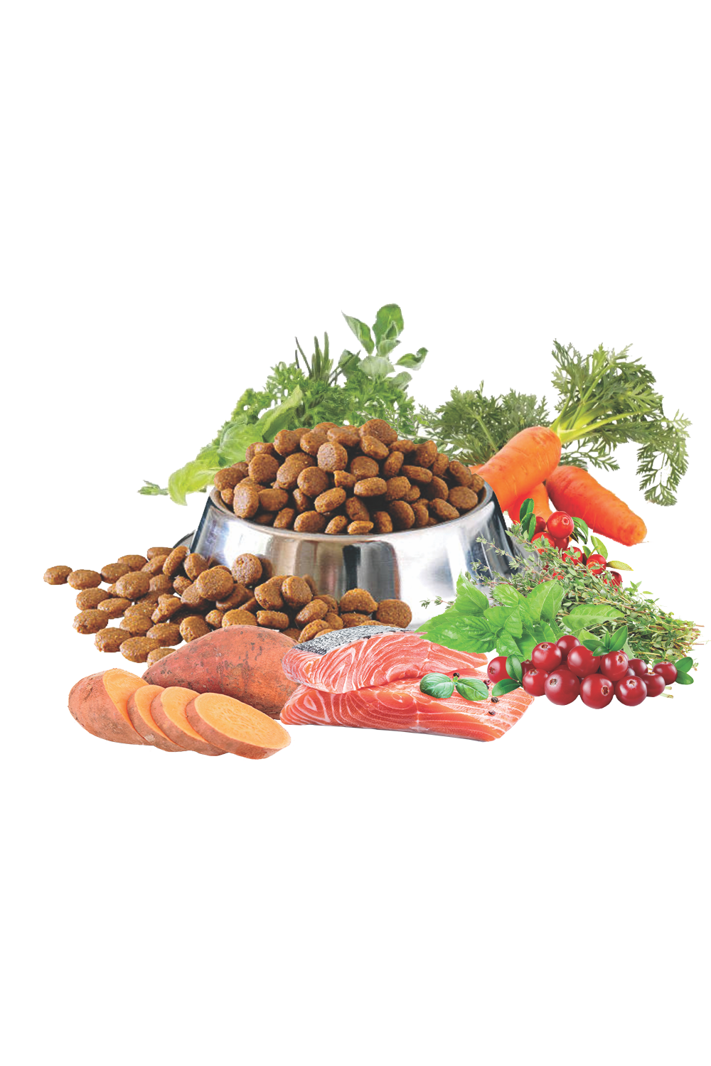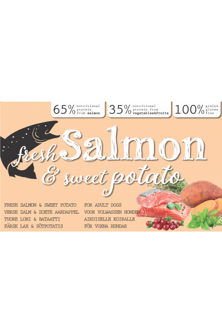 Ingrediënten: Verse zalm (20%), erwten, gedroogde zalm, zoete aardappel, aardappel, aardappelzetmeel, gevogeltevet, erwteneiwit, bietenpulp, biergist, Johannesbrood, lijnzaad, zalmolie, eipoeder, mineralen, inuline, wortel, brandnetel, Echinacea, tomaat, appel, mango, pruimen, banaan, tijm, basilicum, spirulina, cranberry, selderij.