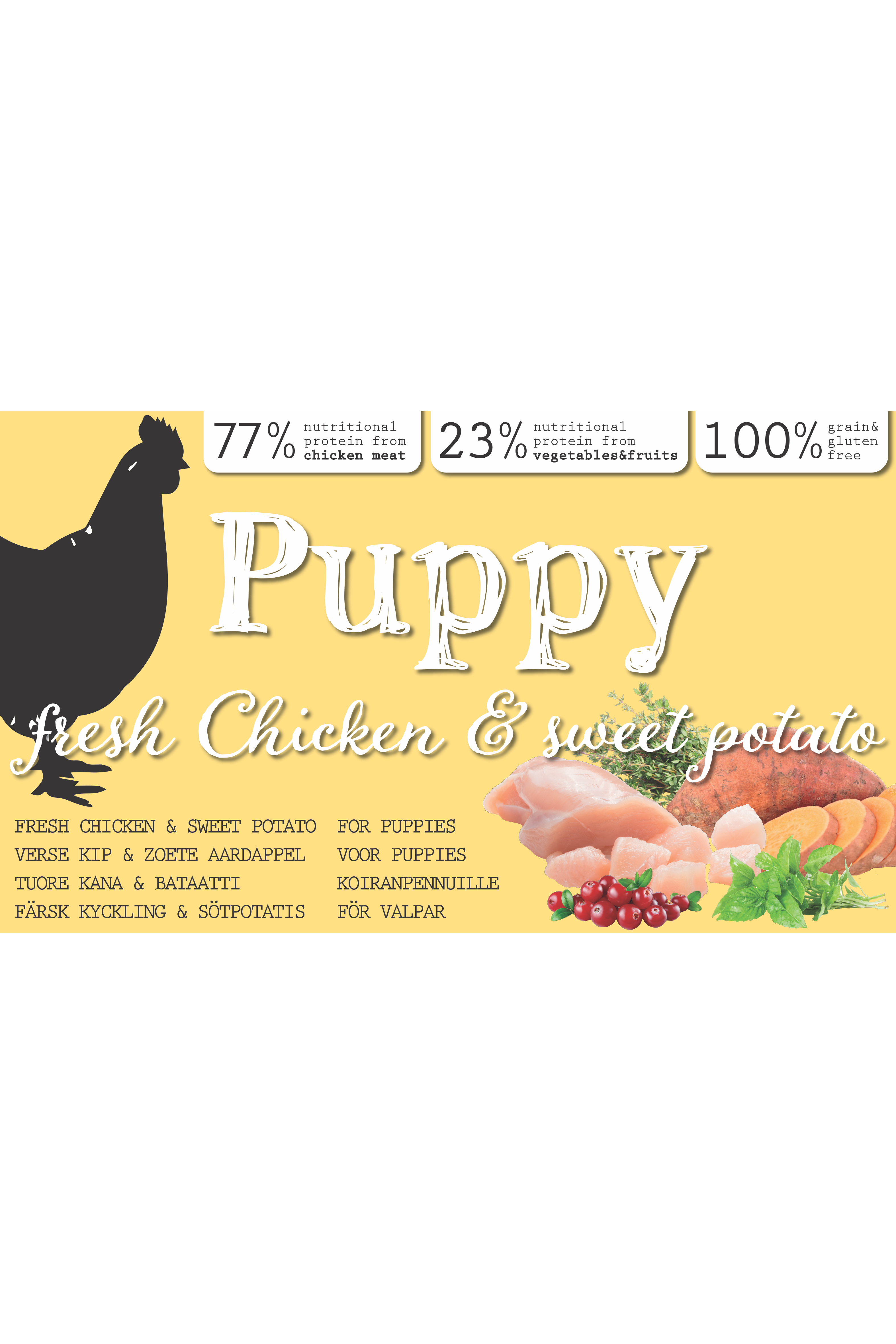 - Eiwitten; 77% kippenvlees, 23% groenten en fruit