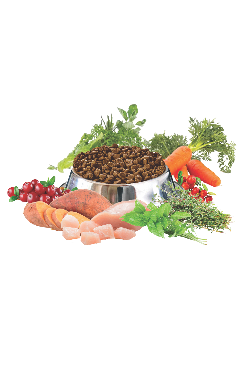 Ingrediënten: Verse kip (20%), gedroogde kip, erwten, gevogeltevet, zoete aardappel, aardappel, aardappelzetmeel, bietenpulp, zalmolie, johannesbrood, lijnzaad, eipoeder, biergist, mineralen, inuline, wortel, brandnetel, Echinacea, tomaat, appel, mango, pruimen, banaan, tijm, basilicum, spirulina, cranberry, selderij.
